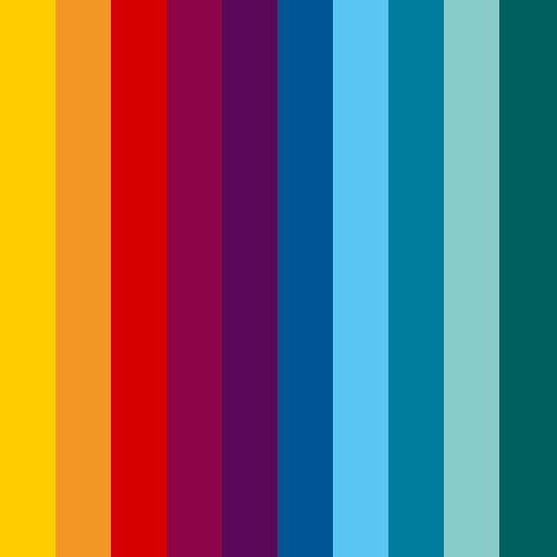 The colors of Friedrich-Ebert-Stiftung are #ffcc00, #f29626, #d70000, #8d0449, #5b085a, #005597, #5bc5f2, #007c9d, #87ccc9, #00605f according to brandlibrary.fes.de.