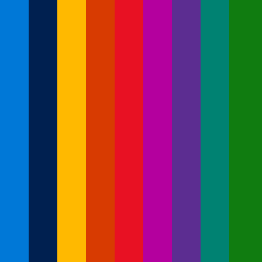 The colors of Windows are #0078d7, #002050, #ffb900, #d83b01, #e81123, #b4009e, #5c2d91, #008272, #107c10 according to www.microsoft.com.